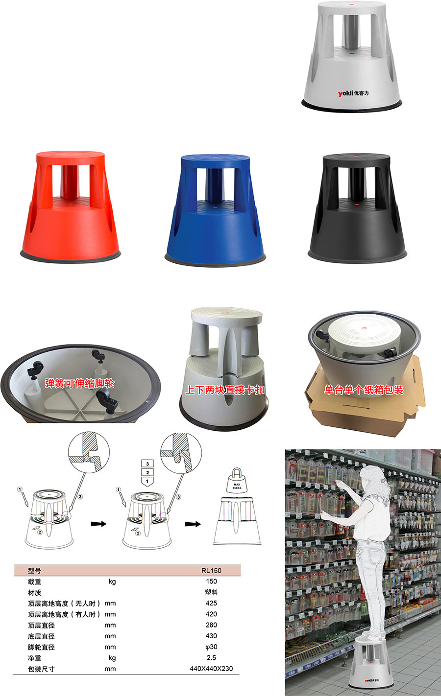 ● 采用彈簧升縮式腳輪設計,人站上去時固定在地面,安全平穩。